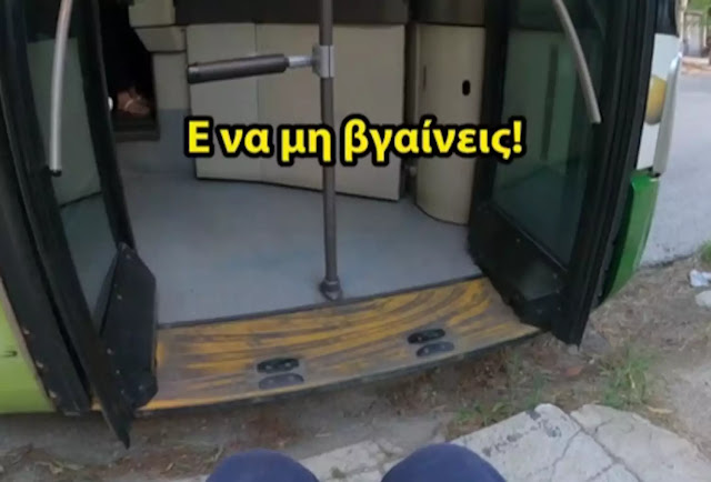 Ο άνθρωπος πλησιάζει με το αναπηρικό του καροτσάκι στη μπροστινή πόρτα του λεωφορείου, με τον οδηγό να ακούγεται να του λέει «δεν έχεις βοηθό ρε;». Όταν του απαντάει αμήχανα «όχι, βγαίνω μόνος μου», ο οδηγός ακούγεται να απαντάει «τότε γιατί βγαίνεις; Να μην βγαίνεις».